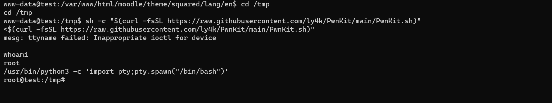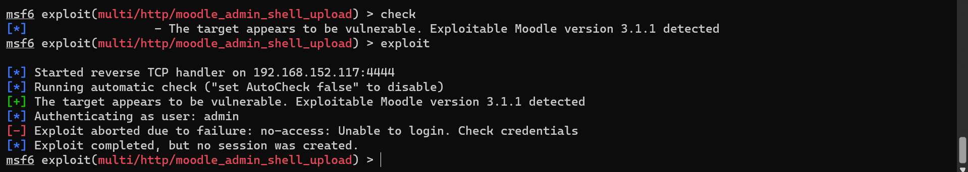 Despite Metasploit failing, we manually exploit Moodle using CVE-2019-11631.