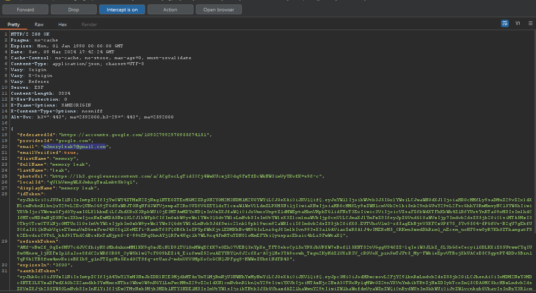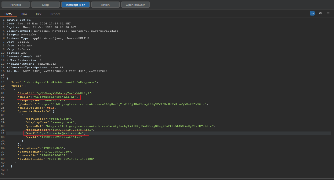 Let’s examine the response of the following request , from the action menu select do intercept response to this request now the response contains our email , that’s interesting let’s try to replace it with the email of the user holding the flag