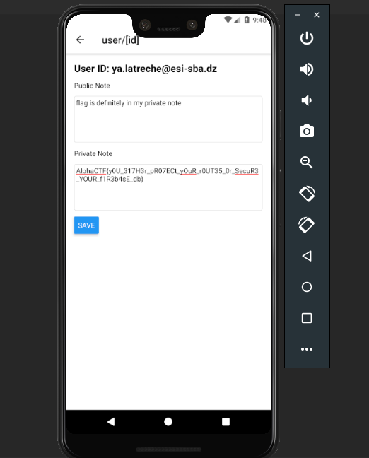 The app use firebase internally , which hints for either an unauthorized access to the database or a misconfiguration which can allow us to manipulate the data somehow . If you look closely you’ll notice that the first note is written by ya.latreche@esi-sba.dz and he mentioned that the flag is written in his private note . which means , in onder to get the flag we need somehow to takeover this user account and fetch his private notes .