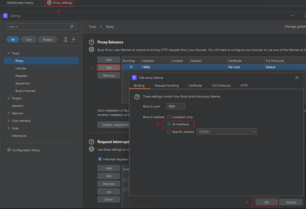 To be able to proxy traffic through burp we need to configure it to listen to all interfaces , to be able to capture traffic from other devices on LAN