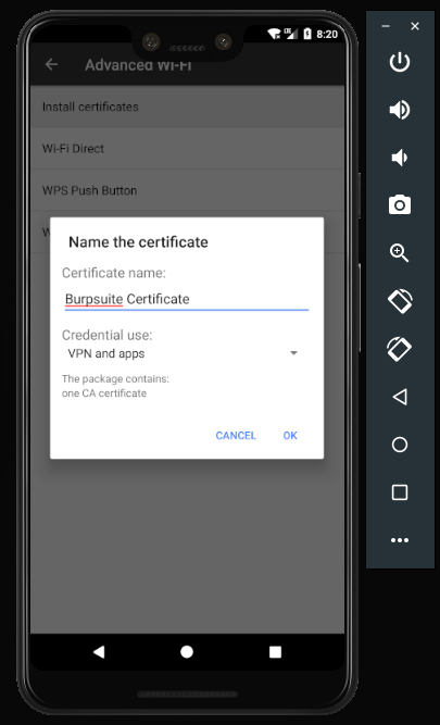 Copy the converted file to the phone storage and go to settings , search for the keyword certificates load cacert.pem and install it and we’re done with configuring burp .