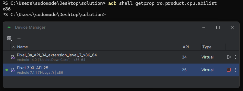 If you’re using android studio the virtual Device manager will display the info as automatically . next , we need to push frida-server-16.2.1-android-x86 to the device using these commands respectively :