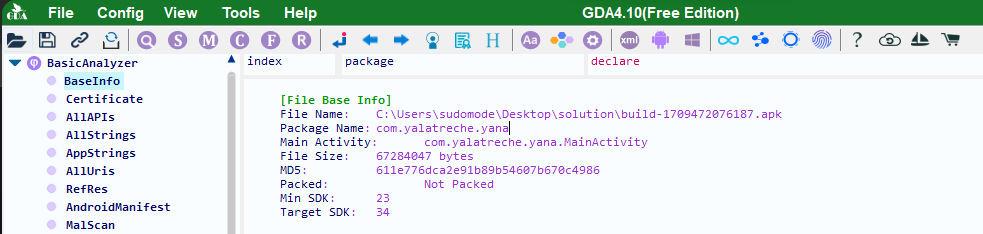 you can get the package name using frida-ps -U , in this case it didn’t work for for some reason so i had to use another tool , you can use any java decompiler to get the package name . in my case I will be using GDA - Android reversing tool , you can get it from the github repo on : https://github.com/charles2gan/GDA-android-reversing-Tool In our case the package name is : com.yalatreche.yana