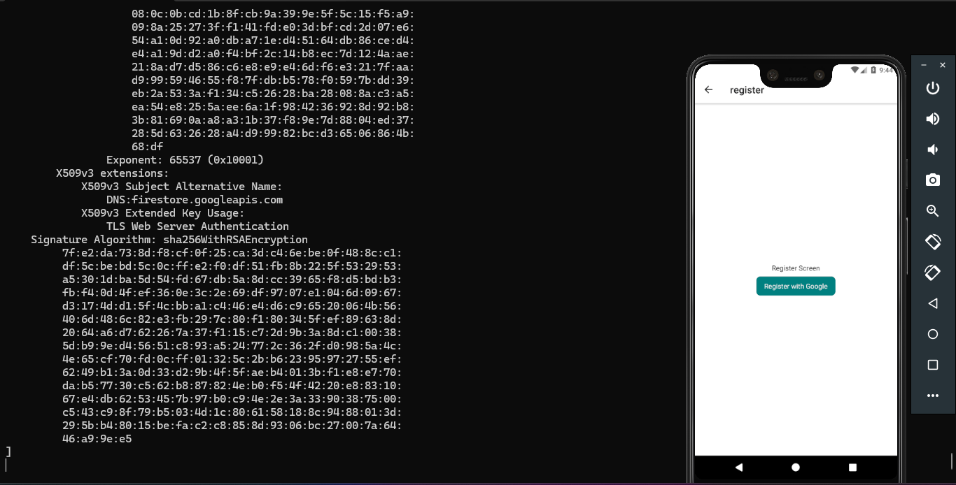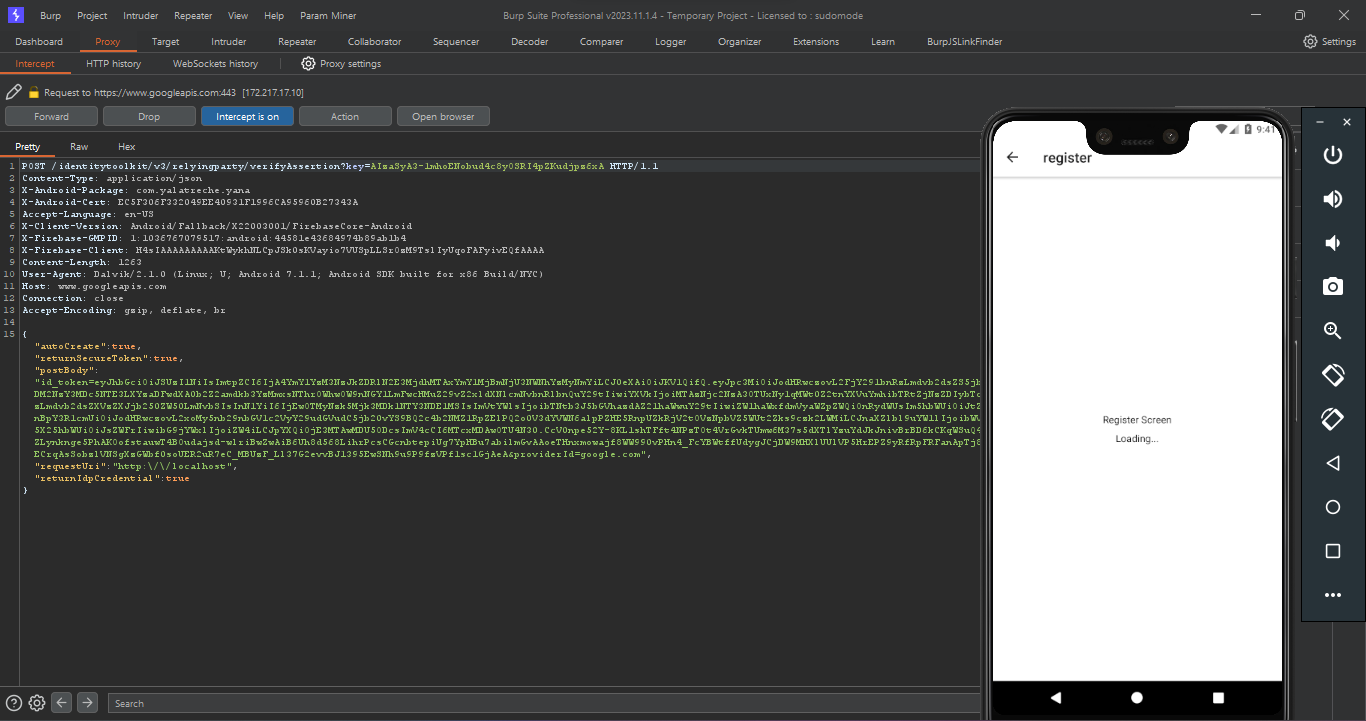 this will launch the app , hit the register with google button and we will be able to intercept the requests successfully with burpsuite as illustrated :